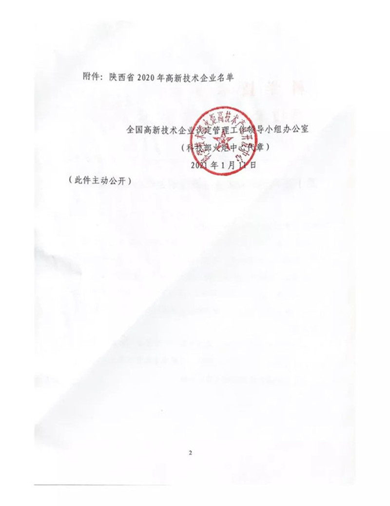 近日,全國高新技術企業認定管理工作領導小組辦公室發布《關于陜西省2020年高新技術企業備案的復函》(國科火字【2021】15號)文件,公示了陜西省2020年高新技術企業認定名單。