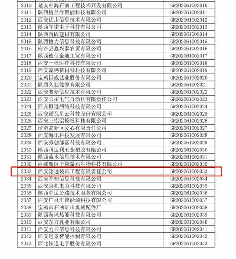 其中,西安翔遠裝飾工程有限責任公司通過認定,獲得“ 全國性高新技術企業”榮譽稱號!