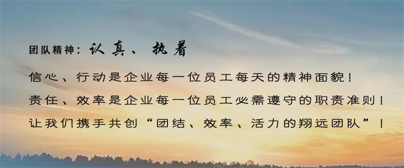 世界上最可怕的兩個詞,一個叫認真,一個叫執著,做到了就離成功不遠了,我們翔遠團隊要始終以認真、執著的態度去面對工作,讓公司這艘大船乘風破浪,安全前行,我們才能在勞動中創造出價值的成就感,實現員工的個人價值,與企業共贏。