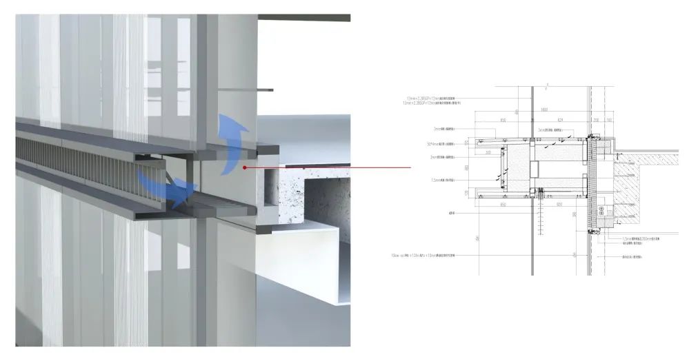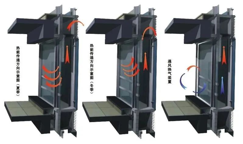 呼吸式幕墻在隔音降噪上的效果非常顯著,可以更好的改善室內(nèi)空氣質(zhì)量,改善室內(nèi)熱環(huán)境,同時(shí)還可以通過百葉調(diào)整室內(nèi)光線,但是它對施工技術(shù)又要求非常高,除多一層的立面構(gòu)造外,還包含了遮陽系統(tǒng)、通風(fēng)系統(tǒng)以及控制系統(tǒng)。