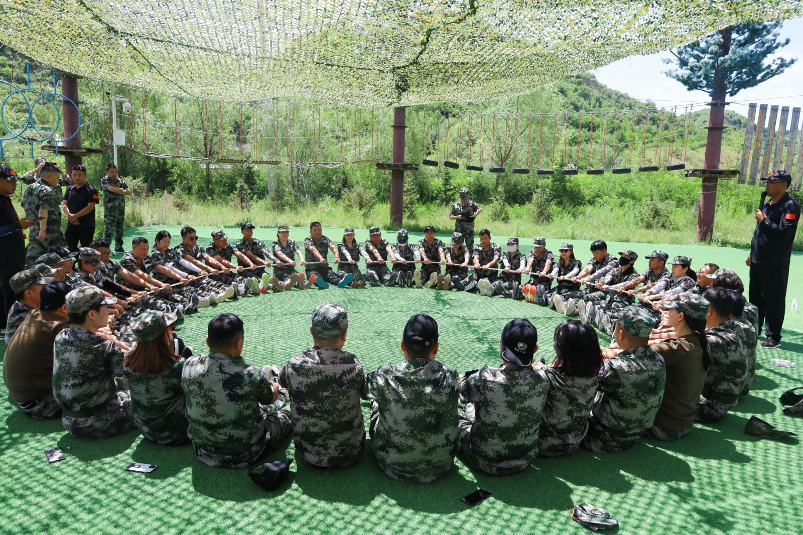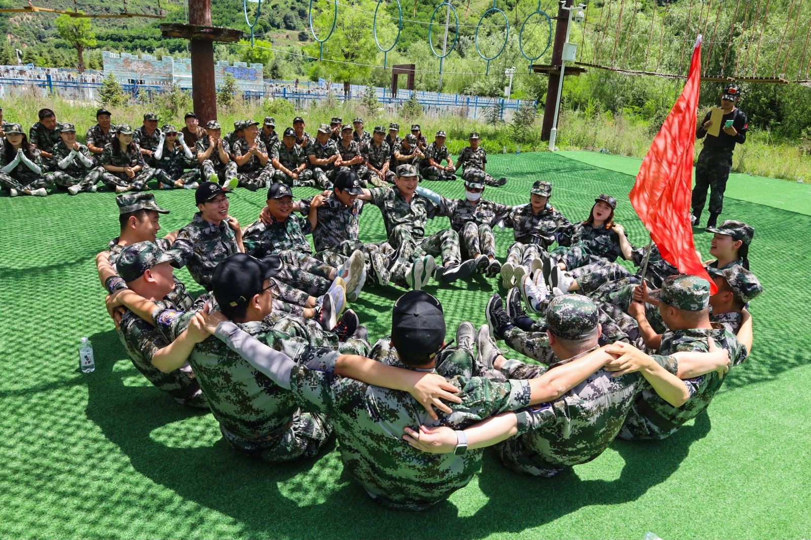 參觀項(xiàng)目結(jié)束后,正式進(jìn)入到我們團(tuán)建培訓(xùn)中。本次團(tuán)建地點(diǎn)設(shè)在我們的革命圣地——延安,希望紅色精神能一直伴隨著我們翔遠(yuǎn)人,大家熱情高漲,換上定制的迷彩服,精神抖擻,整裝待發(fā)。集結(jié)完畢,教官給我們做了莊重嚴(yán)肅的開(kāi)營(yíng)儀式。開(kāi)營(yíng)儀式結(jié)束后,將我們整個(gè)大團(tuán)隊(duì)分為三隊(duì),每隊(duì)都有自己的隊(duì)名,隊(duì)旗、隊(duì)呼、隊(duì)歌。只見(jiàn)大家一個(gè)個(gè)集思廣益,群策群力,都想為自己的小隊(duì)出一份力。