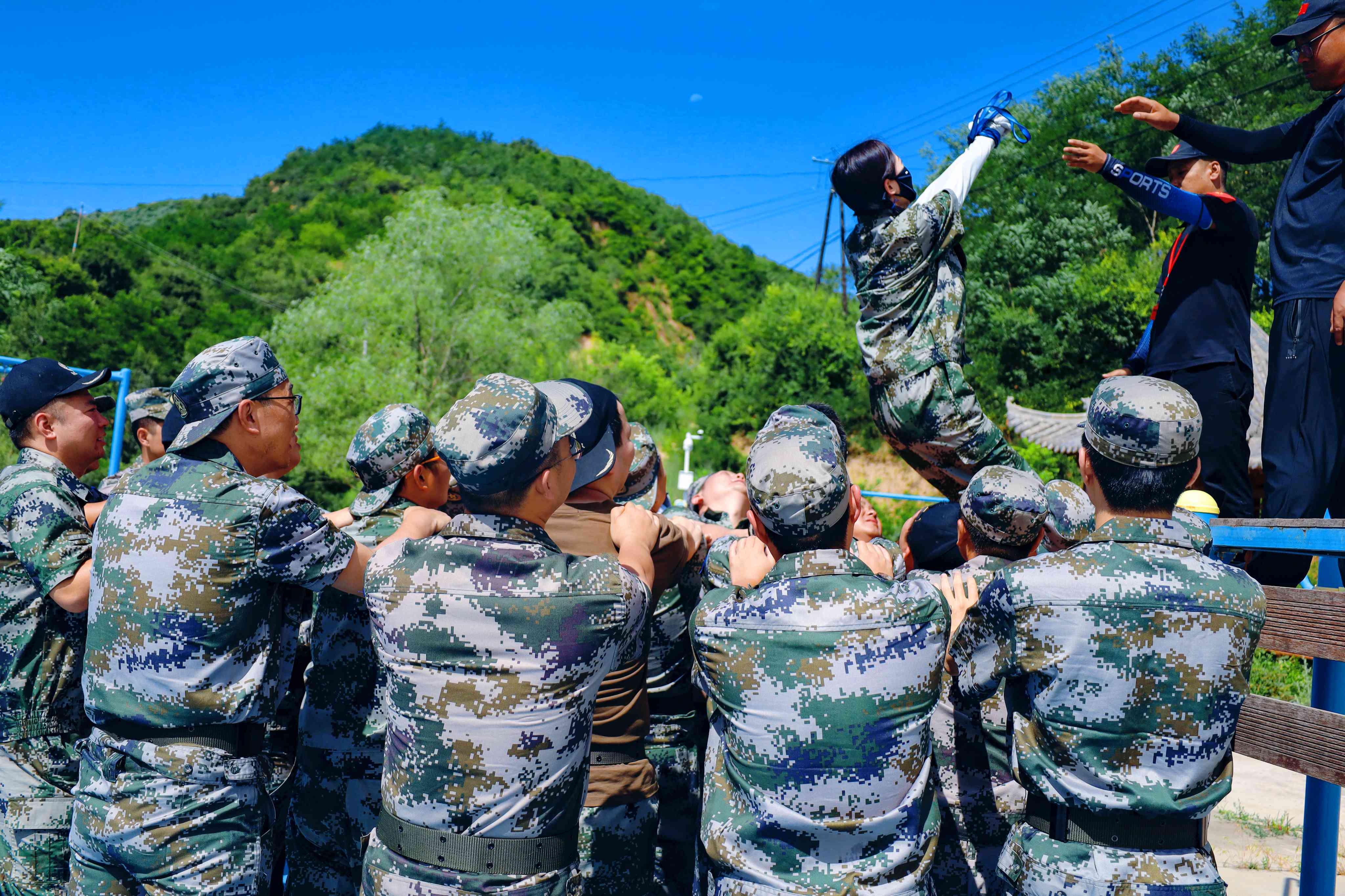 信任背摔是站在一米多高的背摔臺(tái),心中真的有一種害怕的感覺(jué)。其實(shí)膽怯不是來(lái)自背摔臺(tái)的高度,是來(lái)自背摔的方式。一個(gè)人直挺著往后倒,但是當(dāng)你喊出 ”兄弟們準(zhǔn)備好了嗎?” “時(shí)刻準(zhǔn)備著”聽(tīng)到大家發(fā)自心底的吼聲, 心中莫名就有了一股力量,信任的力量,義無(wú)反顧倒下去。因?yàn)槟阒滥愕倪@幫兄弟們一定會(huì)護(hù)你周全。