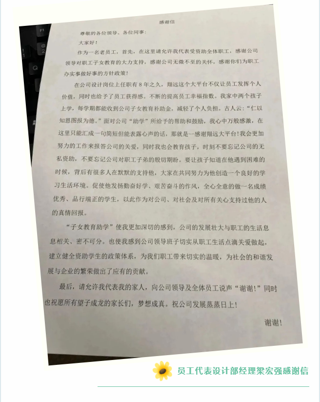 設計部經理梁宏強作為員工代表發言,寫給公司了一份誠摯的感謝信:在公司設計崗位上任職有8年之久,翔遠這個大平臺不僅讓員工發揮個人價值,同時也給予了員工獲得感。不斷的提高員工幸福指數。我家中兩個孩子上學,每學期都能收到公司子女教育補助金,減輕了個人負擔。古人云:“仁以知恩圖報為德。”面對公司“助學”所給予的幫助和鼓勵,我心中萬般感激,在這里只能匯成一句簡短但能表露心聲的話,那就是--感謝翔遠大平臺!